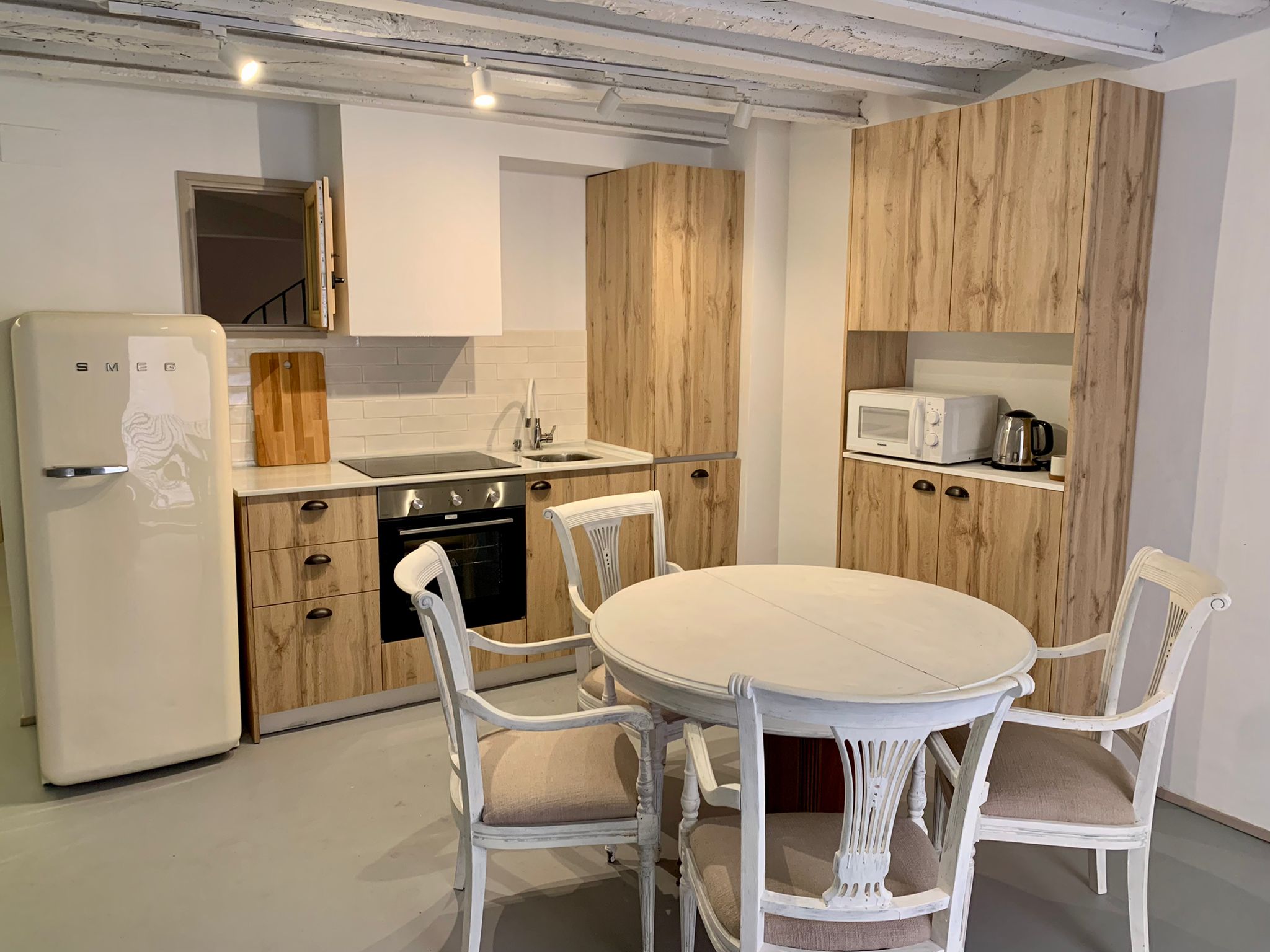 La cuina inclou nevera, microones, cafetera i més.