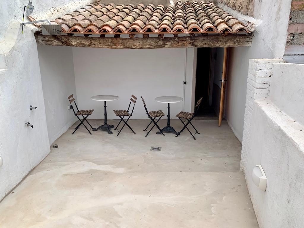 El terrat compta amb un espai amb taules i cadires i una dutxa exterior, molt necessària els dies d'estiu.